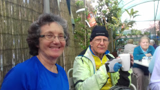 We were delighted to welcome ten new guest riders, including eight on four tandems to our group this afternoon. The tandem riders were members of the Merton sports and social club for people with visual impairment; they hadn't been out on their bikes for a while, so joined us as a first step to getting back to regular cycling together. One of the pairs, Richard and Anna, had to turn back from Cheam village to Nonsuch Park for more practice in a traffic free environment. But the rest of us (11 all together) continued through to the top end of Sutton, and followed the cycle route up past Stanley Park allotments and Sutton Community Farm, to the Blossoms café in Flittons nursery at Woodcote.